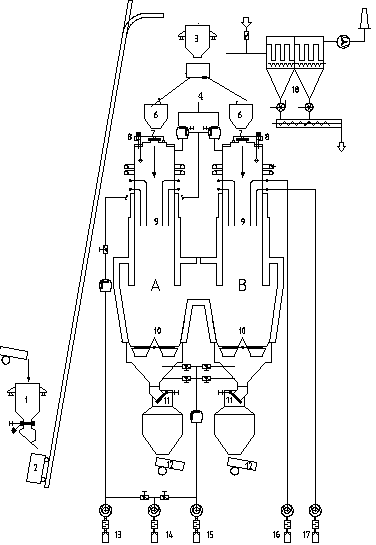 10. Ash machine; 11. Discharge gates; 12. Vibration feeder under kiln; 13. Air combustible fans;