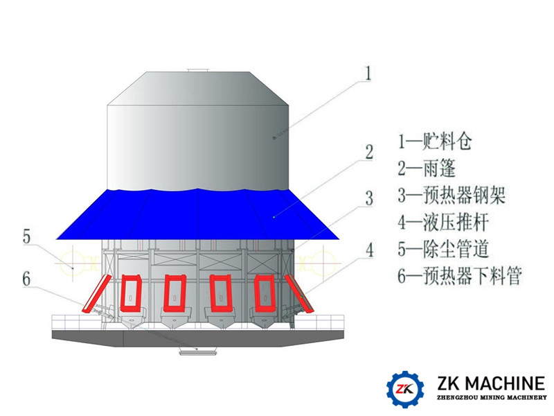 The raw material enters the flue gas material isolation hood from the charging chamber, and is evenly distributed along the cone surface of the central distribution cone in the annular stacking space between the two cylinders of the top heater body. The hot flue gas from the rotary kiln 900-1000°C enters the entire section of the annular stacking space through the air inlet of the gas collection chamber, and flows through the material layer in the reverse direction toward the feed direction to perform sufficient heat exchange. The material preheated to 600°C is pushed into the kiln in turn by means of each pusher unloader. Achieve even feeding. The flue gas whose temperature drops to about 300°C after heat exchange is discharged into the atmosphere through the electrostatic precipitator exhaust machine.