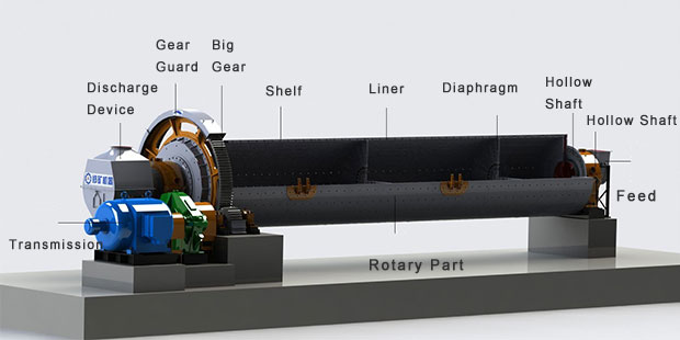 Ball mills are divided into many types due to different specifications, unloading and transmission methods, but their main structures are roughly the same. The ball mill is mainly composed of a cylindrical barrel, a liner, a compartment plate (only available for multi-chamber mills), main bearings, feeding and discharging devices, and transmission devices.