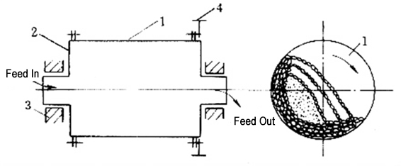 As shown in the figure below, its working principle is as follows: Cylindrical cylinder body 1, end cover 2, bearing 3, transmission gear ring 4 and other components. The cylinder 1 is filled with steel balls or steel rods with a diameter of 25-150mm, which are called grinding media. The filling amount is 25%-50% of the effective volume of the entire cylinder. There are end covers 2 at both ends of the cylinder. The end covers are connected with the flanges of the end of the cylinder by bolts. There is a hole in the middle of the end cover, which is called a hollow shaft. The hollow shaft is supported on the bearing 3 and the cylinder can rotate. A large gear ring 4 is also fixed on the cylinder. In the drive system, the motor drives the large gear ring and the cylinder through the coupling, reducer and pinion to rotate slowly. When the barrel rotates, the grinding medium rises to a certain height with the barrel wall, and then falls or drops down in a parabola. Due to the hollow shaft on the end cover, the material is fed into the cylinder from the hollow shaft on the left, and gradually spreads to the right. When the material moves from left to right, the rotating cylinder will bring the steel ball to a certain height. Falling crushed the material, and a part of the steel ball in the barrel has a falling state to grind the material, and the entire movement process is also the crushing process of the material.
